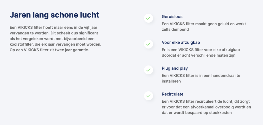Een VIKICKS plasmafilter is een revolutionair filter dat kookgeuren uit uw ruimte verwijderd, terwijl het de warmte van uw huis in de ruimte laat. Door de verschillende afmetingen en vormen van de VIKICKS filters kunnen deze in bijna elke afzuiginstallatie worden geplaatst.